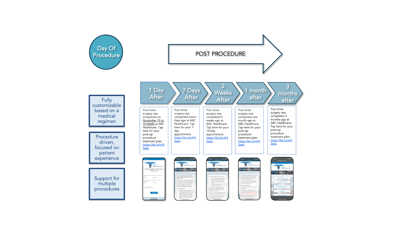 Organizations can send a single message or launch automated communication sequences that guide patients through recovery, follow-up care, or additional resources.